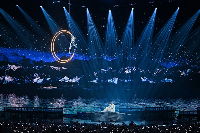 21:05. Трио «Nomad» исполнили трогательную песню о любви. Композиция сопровождалась спецэффектами – на импровизированной Луне в воздухе танцевала девушка.